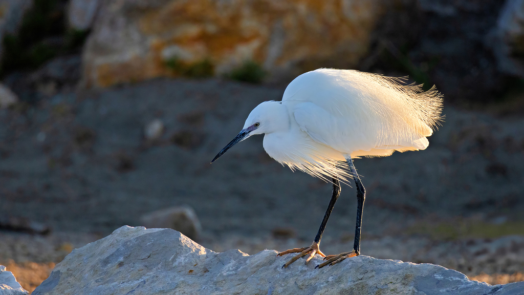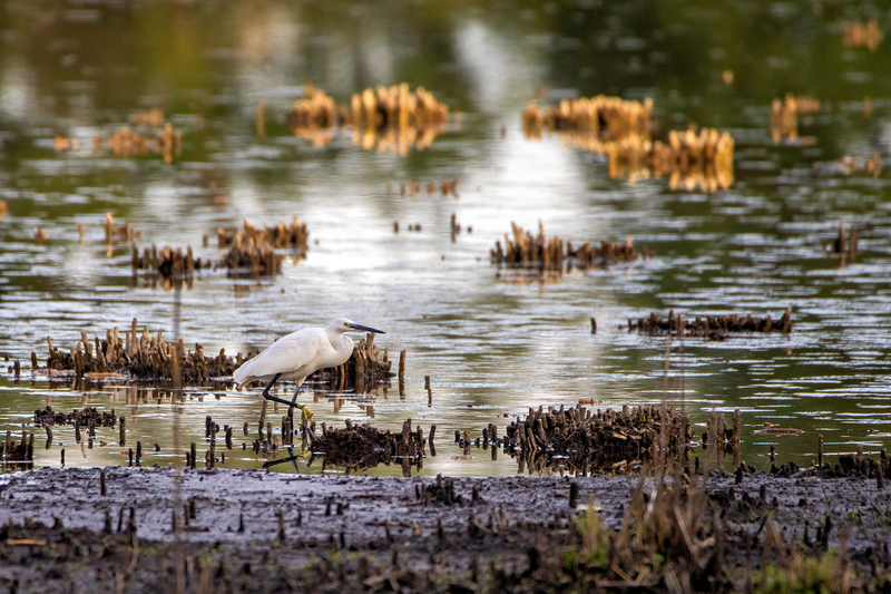 Der Seidenreiher (Egretta garzetta) ist ein schlanker, rein weißer Reiher mit schwarzen Beinen und auffällig gelben Füßen.