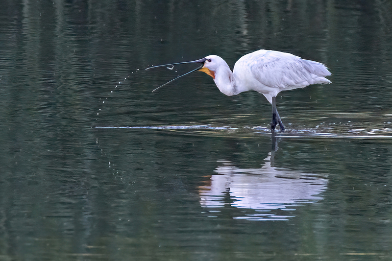 Typisch ist seine besondere Jagdweise: Er schreitet durch das Wasser und schwenkt seinen geöffneten Schnabel seitlich hin und her.