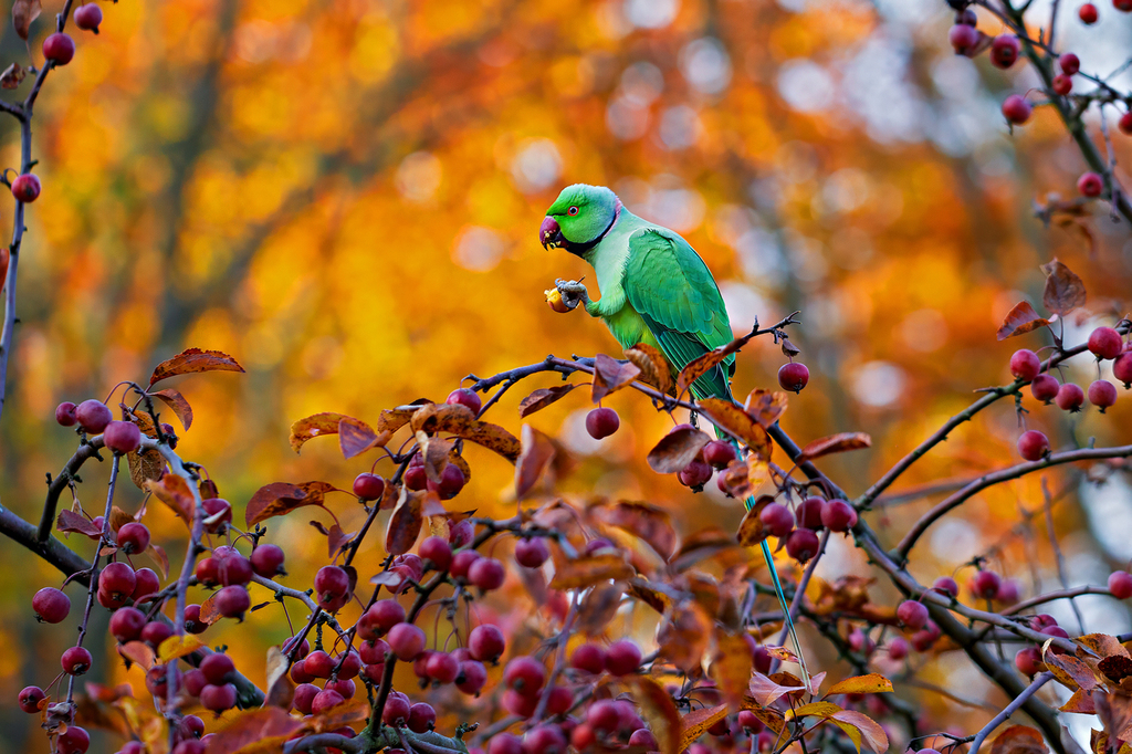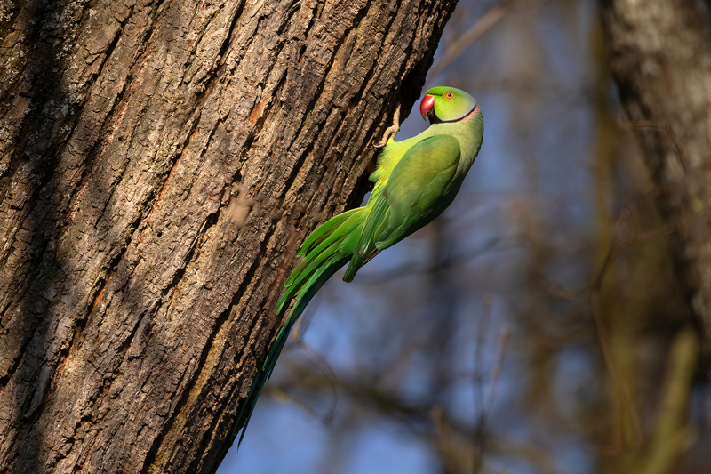 Da die Halsbandsittiche Neozonen sind, erfreuen sie sich nicht bei allen Mitbürgern großer Beliebtheit. Sie haben in den letzten Jahren teils große Kolonien in wärmeren Gebieten wie hier im Rhein/Main-Gebiet gebildet. Sie nutzen den kleinen Temperaturunterschied zwischen Stadt und Land. Und sollte es mal richtig kalt werden, dann haben sie keine Berührungsängste untereinander. Dann ist kollektives Kuscheln angesagt. Dabei hinterlassen sie eine Menge Kot und ihr lautes Geschrei kann schon ziemlich nerven. Aber hübsch sind sie schon - das beweisen die Bilder der nachfolgenden Galerie hoffentlich!! In Parks oder größeren Gärten sind sie häufig anzutreffen...also immer dem Geschrei nach - dann findet man sie schon!!