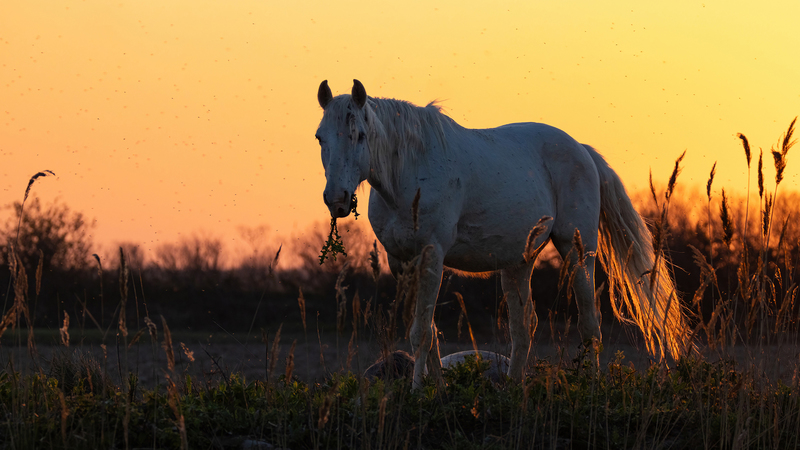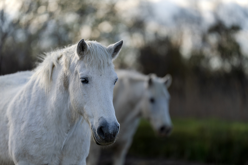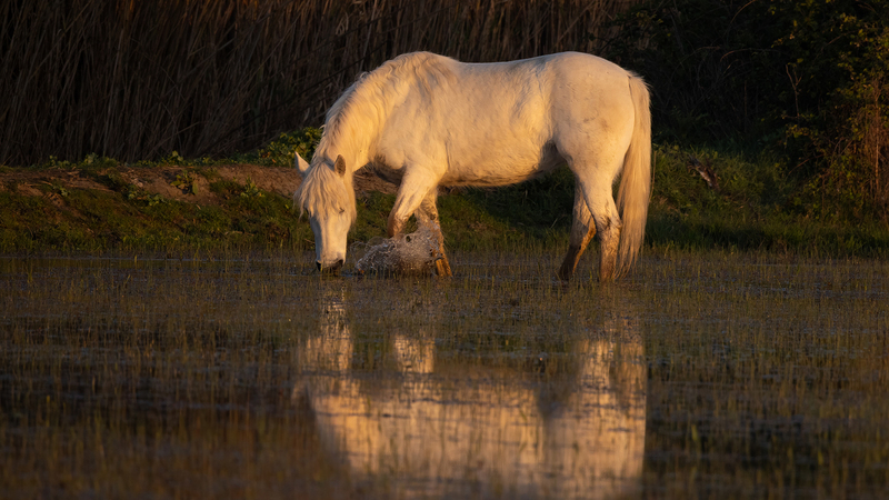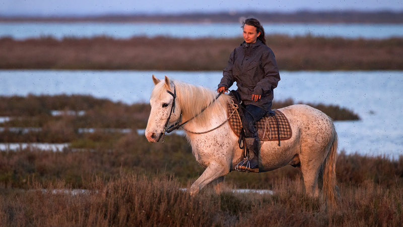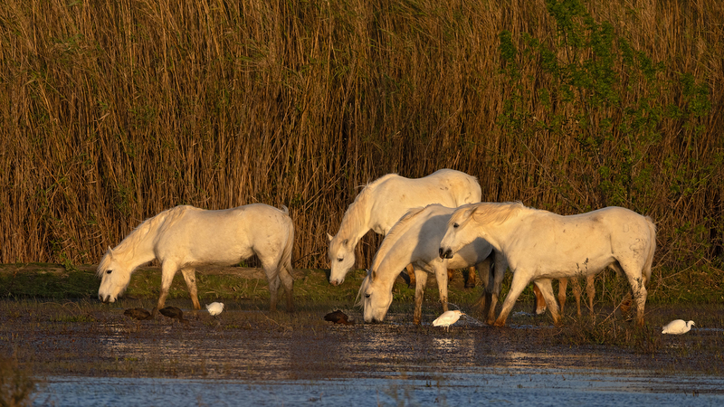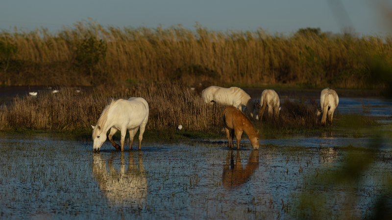 Wer uns kennt, weiß natürlich, dass wir ein großes Herz für Pferde aller Art haben. Deshalb beginne ich in den Galerien auch mit den eleganten Huftieren. Bei der Erkundung der Region entdeckten wir einige schöne Spots. Ein Sumpfgebiet, in dem die Pferde teilweise im flachen Wasser standen, gefiel uns so gut, dass wir gleich dreimal zum Sonnenaufgang dorthin fuhren. Dort entdeckten wir ein Werbeschild, auf dem stand, dass diese Pferde auch für Fotoshootings gebucht werden können. Wir fragten nach dem Preis für ein solches Shooting in diesem Sumpfgebiet. Der Preis lag bei 500 Euro, was uns zu zweit zu teuer erschien. Außerdem mögen wir es nicht, wenn Tiere für Fotos durch die Gegend getrieben werden. Wir bevorzugten es, die Pferde in ihrem natürlichen Verhalten zu fotografieren. Das ist natürlich nicht so spektakulär, aber ein paar sehenswerte Bilder haben wir durchaus auf den Chip gebracht. Die Camargue eignet sich auch für Reitertouren. So konnten wir mehrere Reitergruppen ablichten, die im Abendlicht durch die Sumpflandschaften ritten.